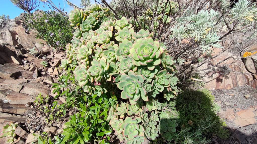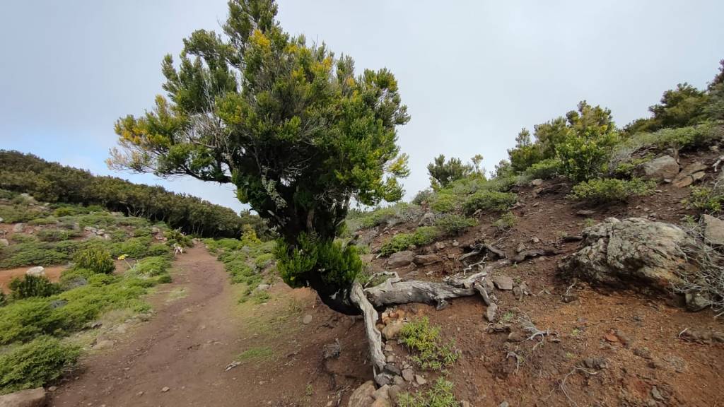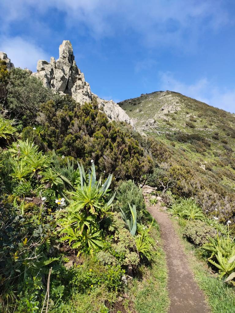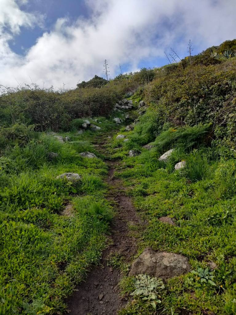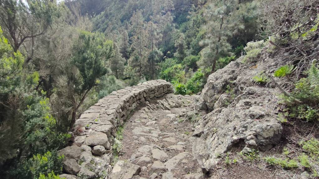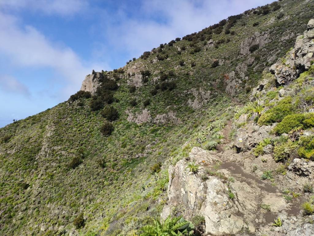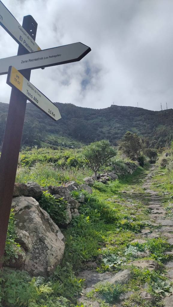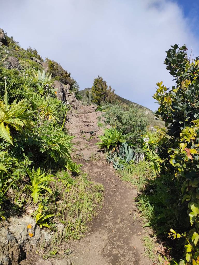 Desde Los Bailaderos continuaremos nuestro camino de nuevo por el Callejón de Teno. Un sendero muy bien delimitado, sin pérdida ninguna, y con bastante tramos empedrados que nos permitirán el disfrute de un paisaje vegetal bastante rico. Las especies vegetales se entremezclan y te encuentras con zarzales y pencas, entre tabaibas, y pinos entre brezos. Más arriba, los pinos comienzan a mezclarse con el fayal-brezal, apareciendo además del brezo, especies como el aceviño. No te faltarán especies endémicas como la cerrajilla de Teno, los tajinastes azules, la crestagallo, el bejequillo tinerfeño o el cabezón de Teno, entre otras.