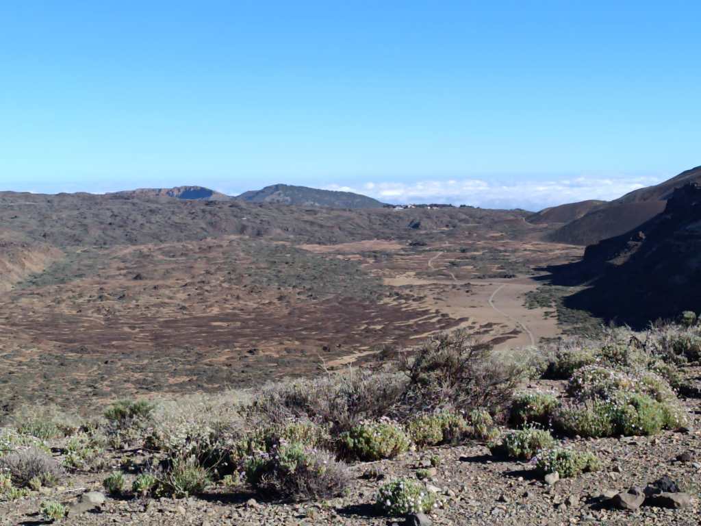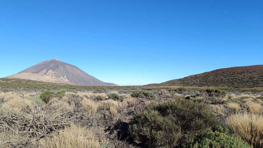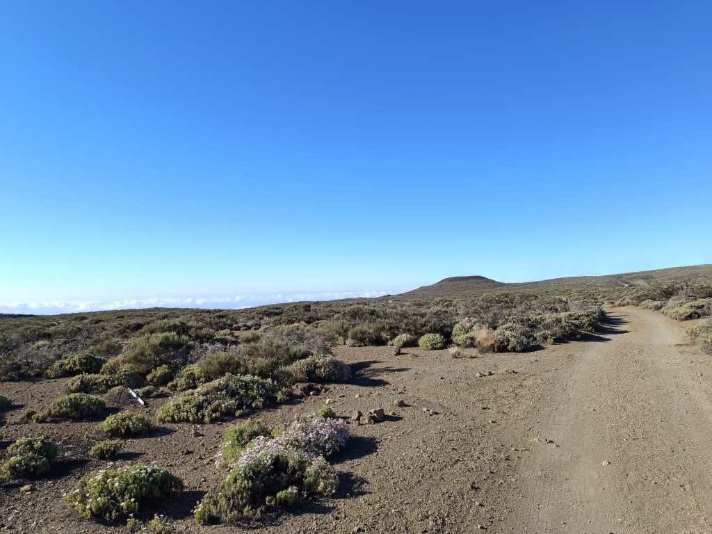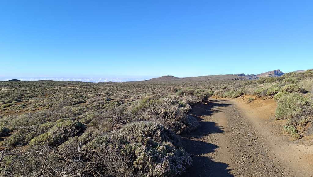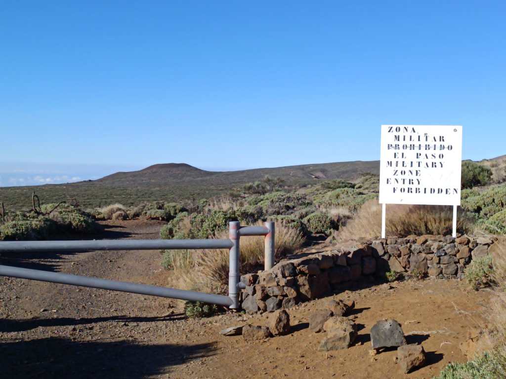 Partimos del kilómetro 39 de la TF 24 por una cómoda pista que nos llevará rápidamente hasta el Llano de Maja, rodeada de montañas como la de Enmedio, Maja, Abreu y Colorada. Las primeras vistas impresionantes de El Teide se presentan como si de una postal se tratase. No tardamos en acercarnos hasta el Llano de los Infantes, donde un cartel de «Zona Militar» se cruza en nuestro camino. Un campo de maniobras del Ejército que da que pensar, como un lugar tan majestuoso, sirviera para estos menesteres…
