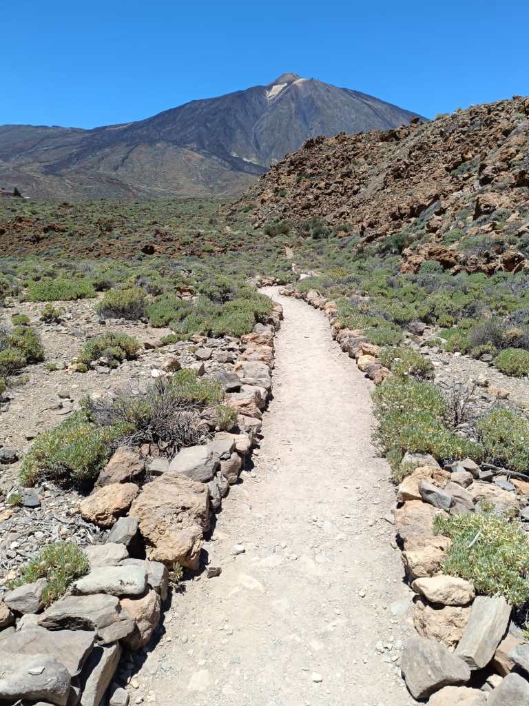Un filo que transita por la parte alta del circo del Teide; una vez en pleno circo de Las Cañadas te maravillas ante el imponente paisaje y la altura del enorme volcán.