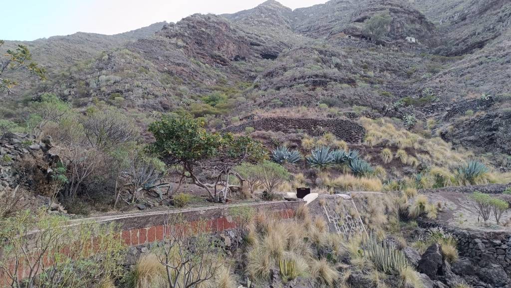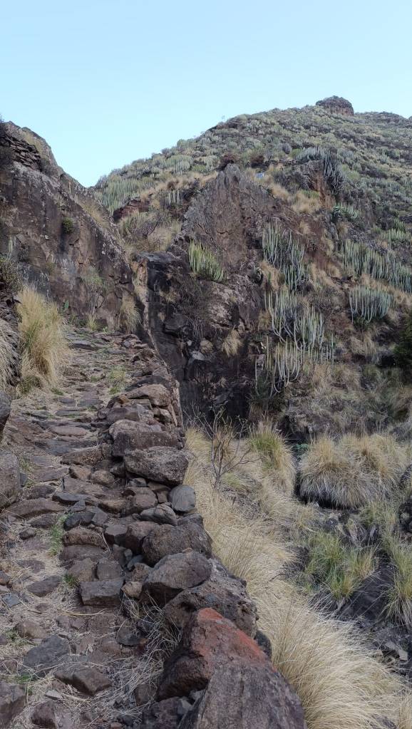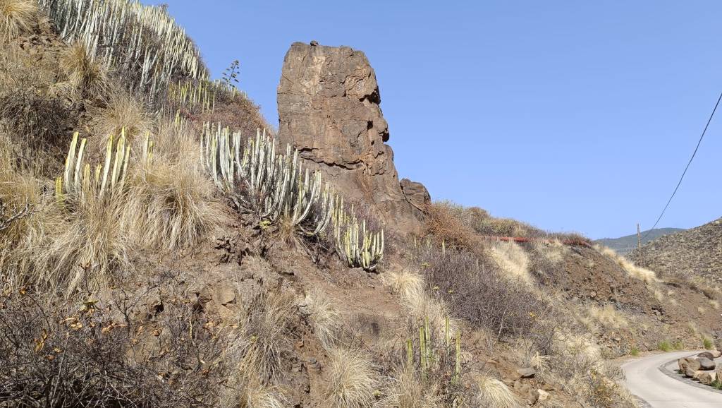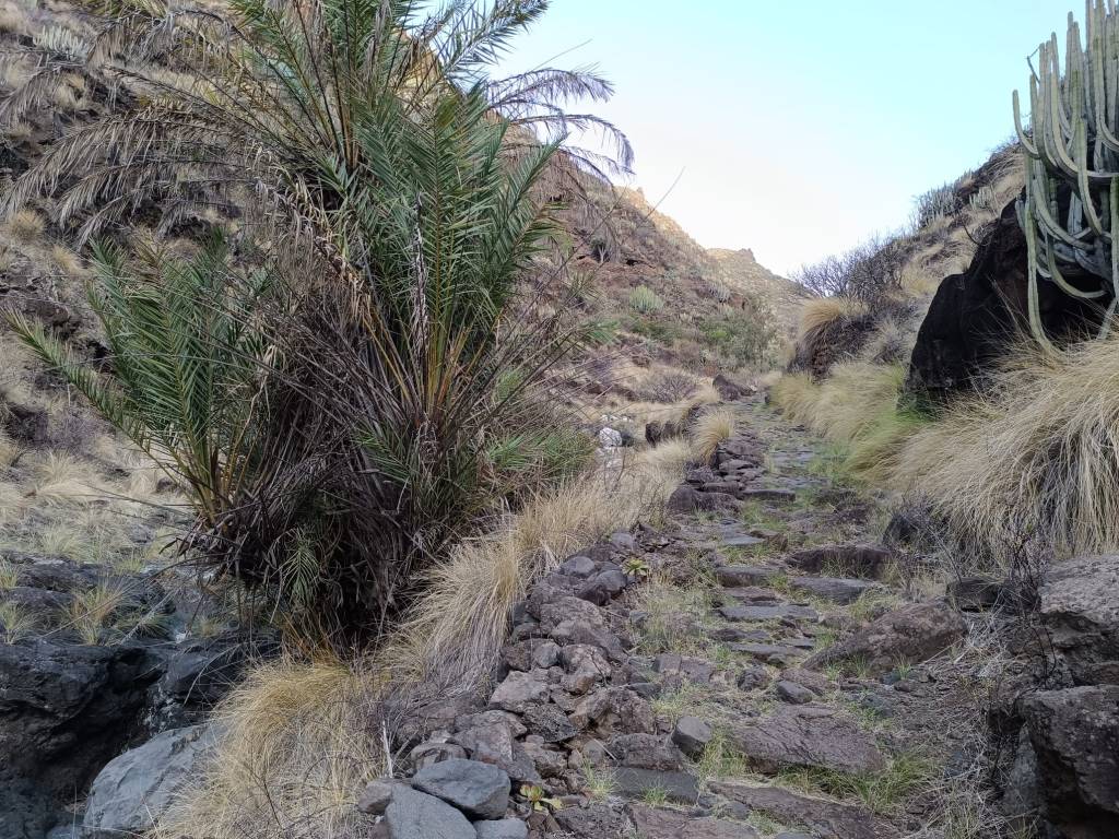 Esta primera parte de subida, nos encontramos antiguas huertas de cultivo abandonadas. Solamente quedan ya los bancales de piedra y algún que otro árbol frutal que a duras penas sobrevive. Pero si hay algo que llama la atención, eso es sin duda, la cantidad de rabo de gato que hay por todas partes. Esta planta invasora, una gramínea del noreste de África que se introdujo con fines ornamentales en los años 40 y ha crecido tanto en Canarias que ha llegado a colonizar y expulsar a algunas especies autóctonas. Pese a este panorama desolador que vemos en este barranco, la flora autóctona del cardonal-tabaibal resiste a duras penas con bonitos ejemplares por los murallones de este encajado barranco.