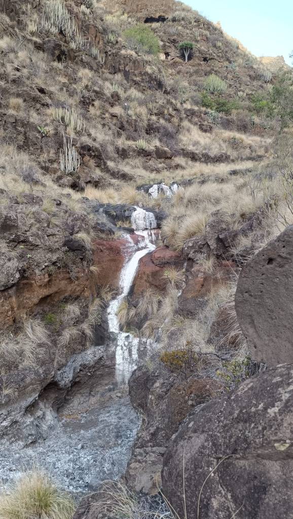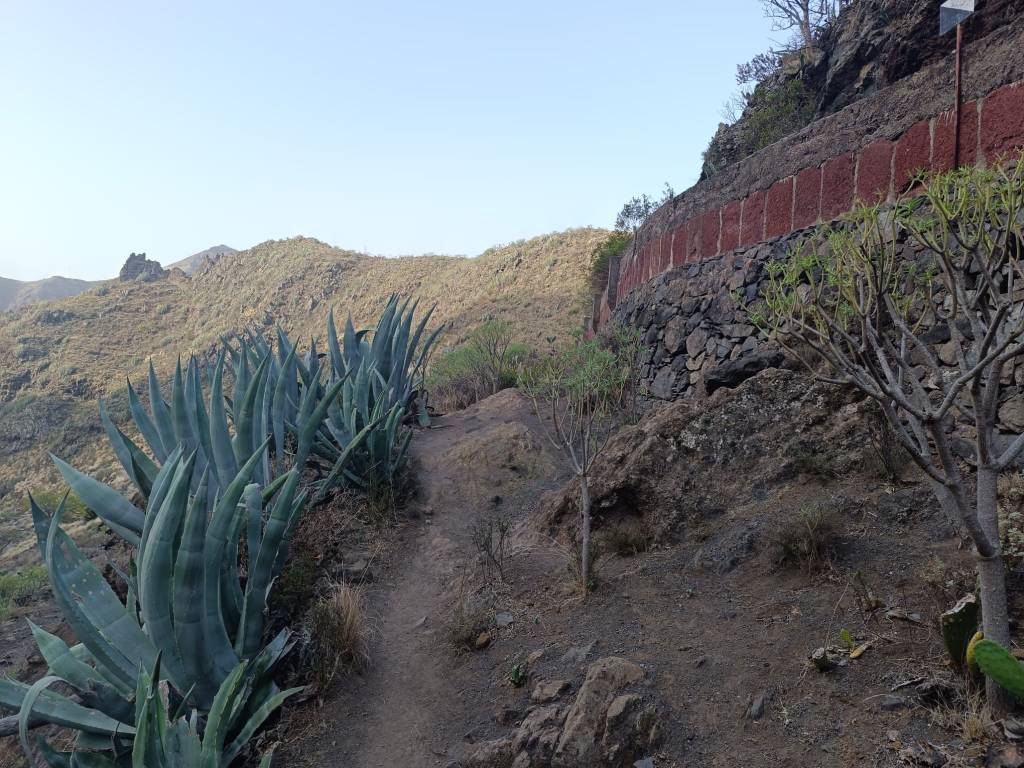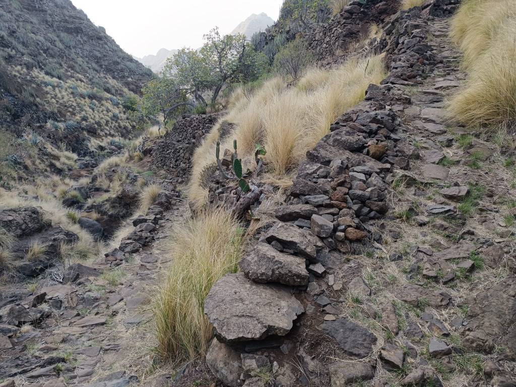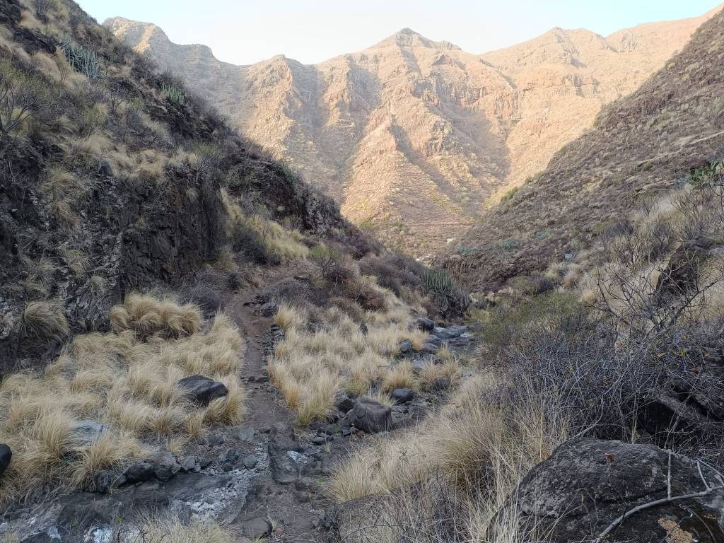 Saliendo desde el caserío de Valle Luis, comenzamos por un empedrado camino, que por cierto es un camino real, a adentrarnos en el interior de estas montañas. Con una constante subida vamos vamos remontando el cauce del barranco Luis. Un barranco en esta época del año sin agua, pero que sin duda en invierno, o en la época de lluvias es un espectáculo ver correr el agua y la cantidad de cascadas y charquitos que se forman.