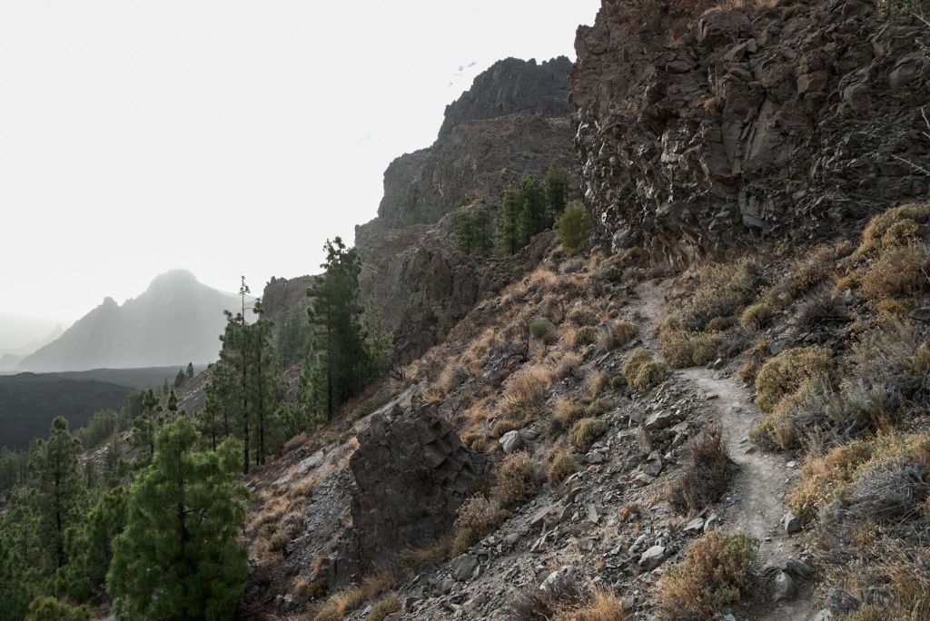 Abandonamos la pista y tomamos una vereda a la derecha que nos llevará a la degollada del Cedro. Es un sendero estrecho y pedregoso que nos permitirá ganar altura, y al llegar a lo alto de la subida, disfrutaremos de vistas magníficas del Parque, con El Teide y Pico Viejo.