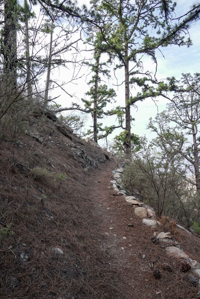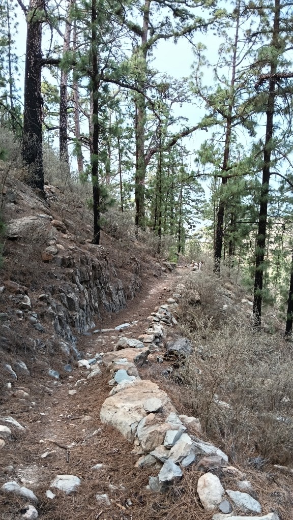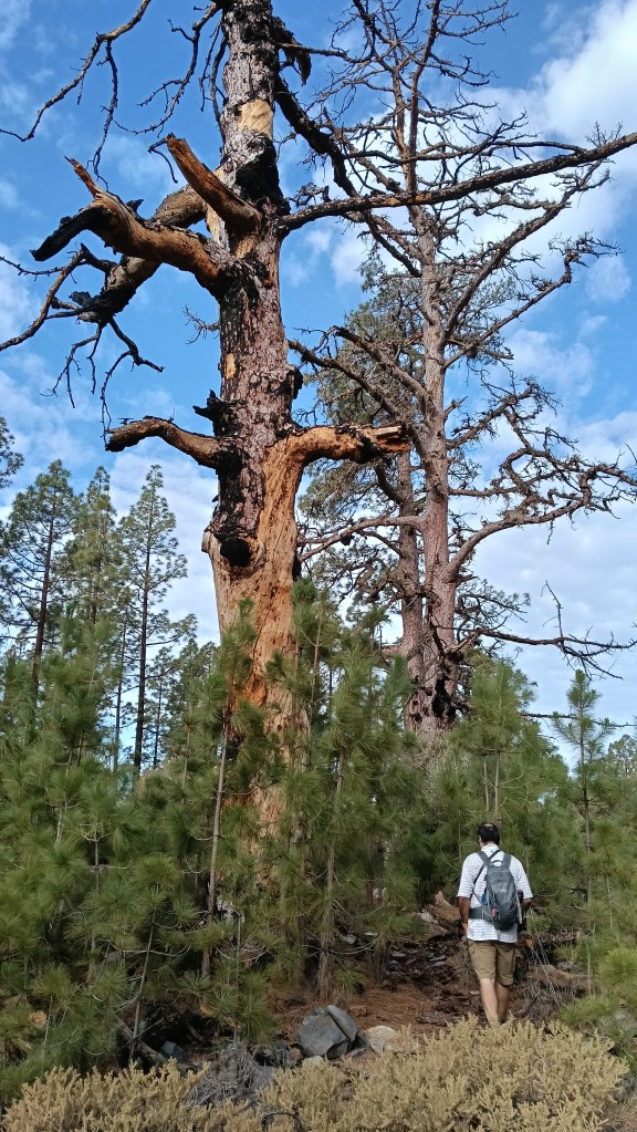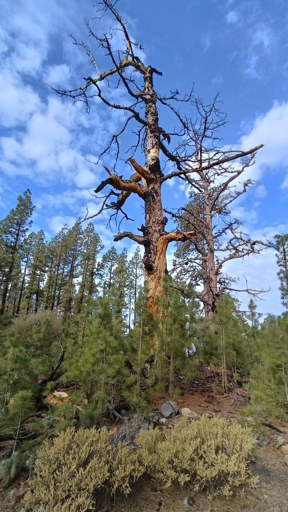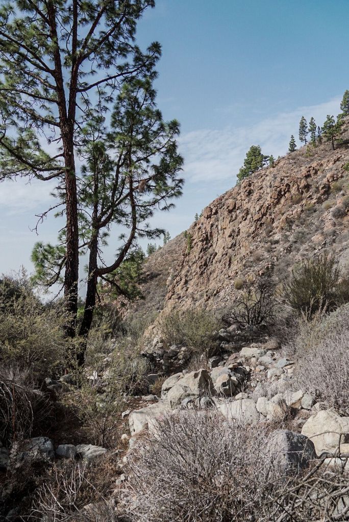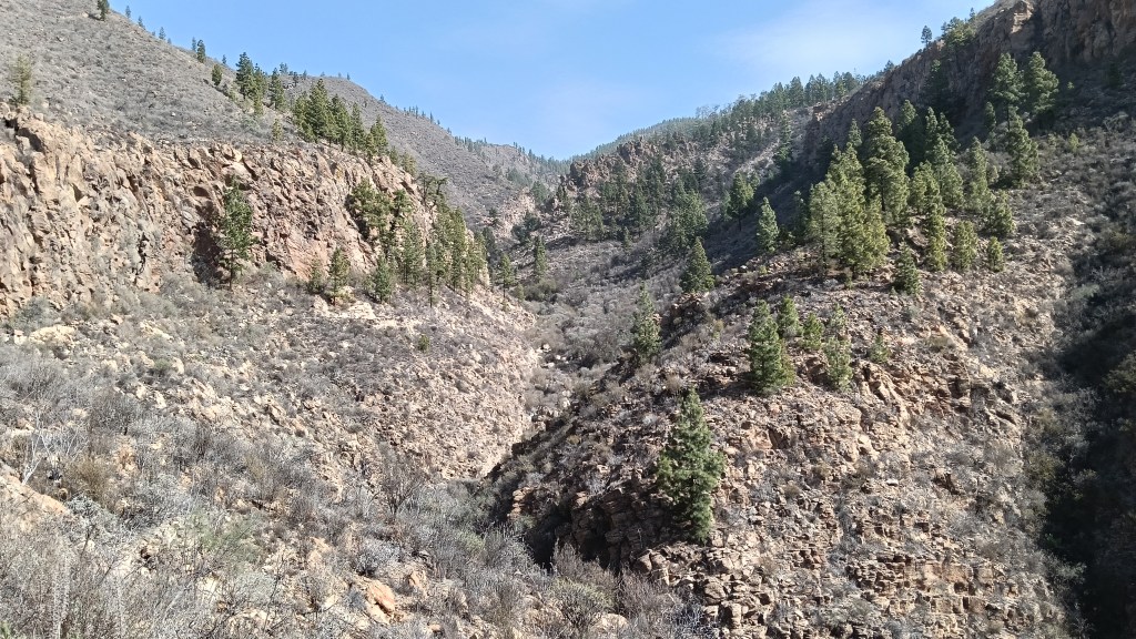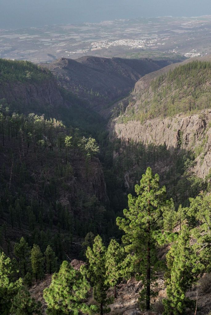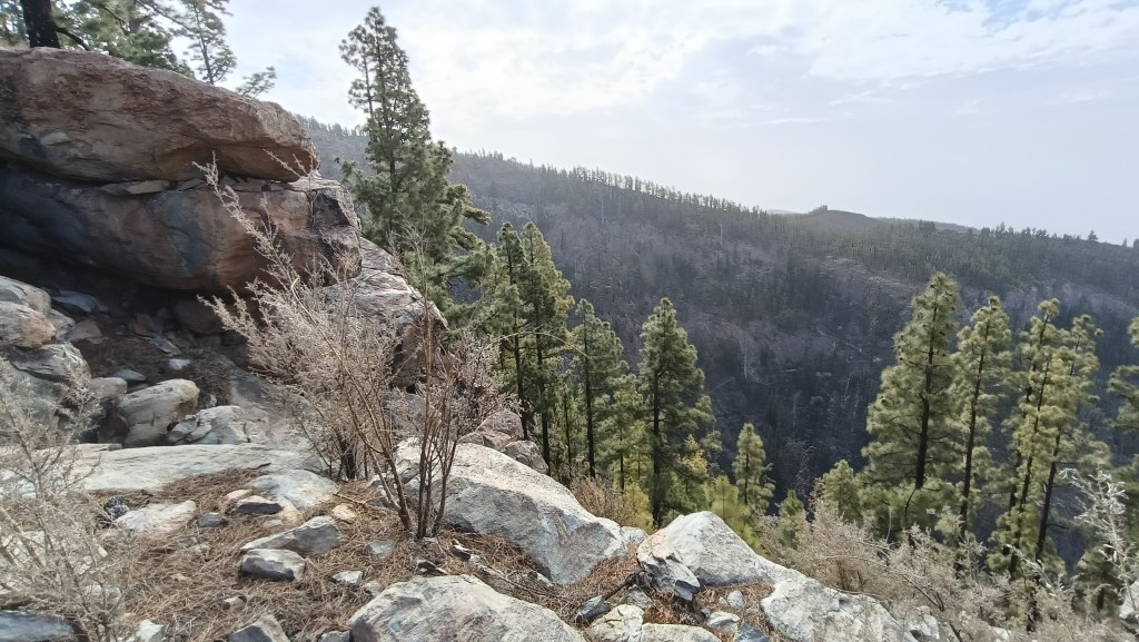 Un camino poco transitado pero bien acondicionado, entre un maravilloso bosque de pinos, donde luchan por sobrevivir después del incendio de unos años. Durante este descenso, encontramos ejemplares enormes de pinos que no aguantaron el incendio y que hoy están caídos, formando parte del paisaje. Pero sin duda lo mejor es llegar al mismo borde del Barranco del Tágara, una pared casi vertical que nos proporciona una de las mejores vistas de la ruta, sin duda alguna, de este gran barranco.