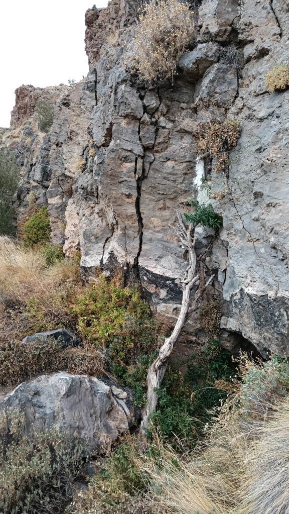 Abandonamos el gran barranco. Atrás dejamos el pinar, y entramos en un terreno en el que prosperan almendros, higueras, tuneras, tabaibas, verodes, bejeques, inciensos, tajinastes, vinagreras, jaguarzos, cornicales y demás plantas de la zona seca, todo un cambio de paisaje y donde hay que tener en cuenta que no hay nada de sombra.
