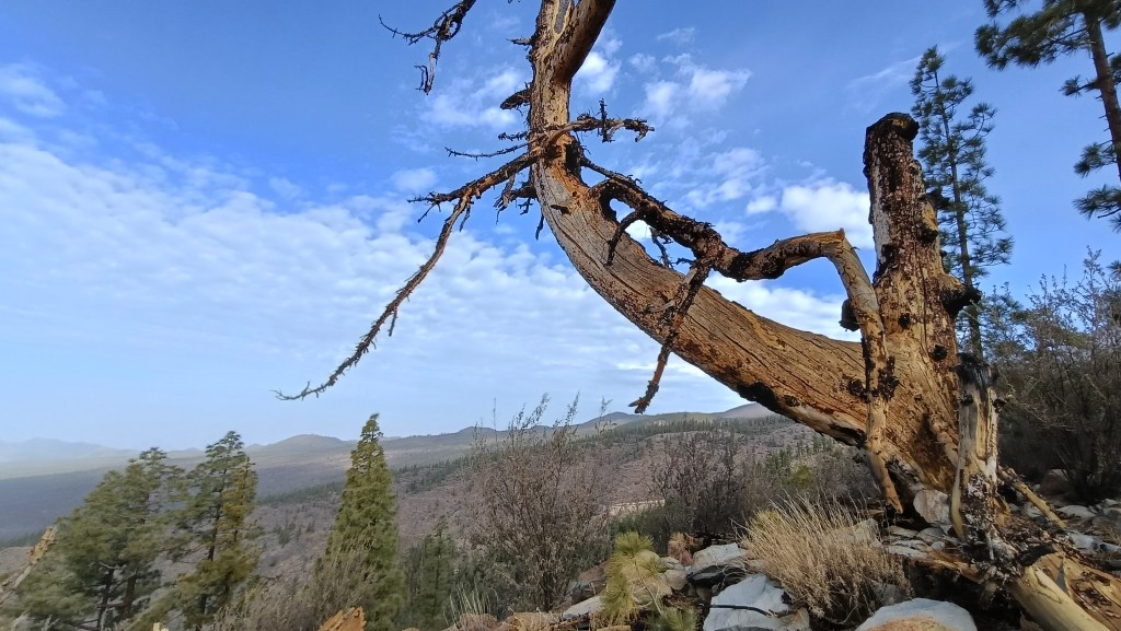 Una increíble vista desde la cima hasta el mar del Barranco del Tagara nos deja sin aliento. La amplia panorámica de las medianías y la costa isorana se despliega ante nosotros. Observamos los viejos pinos canarios, algunos muertos y ennegrecidos, pero aún en pie, tras haber sufrido múltiples incendios. Junto a ellos, hay otros con troncos partidos, arrastrados por tormentas y desprendimientos de rocas, los cuales nos muestran que esta gran fisura en la tierra puede ser tanto un refugio como un cementerio forestal.